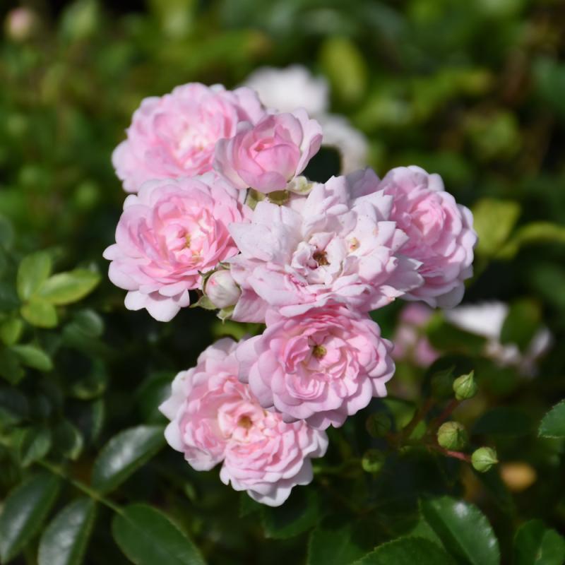 A popular old-fashioned shrub rose, featuring clusters of double light pink flowers all season long; compact and very low-growing, hardy and resistant to disease, makes an excellent flowering groundcover; all roses need full sun and well-drained soil