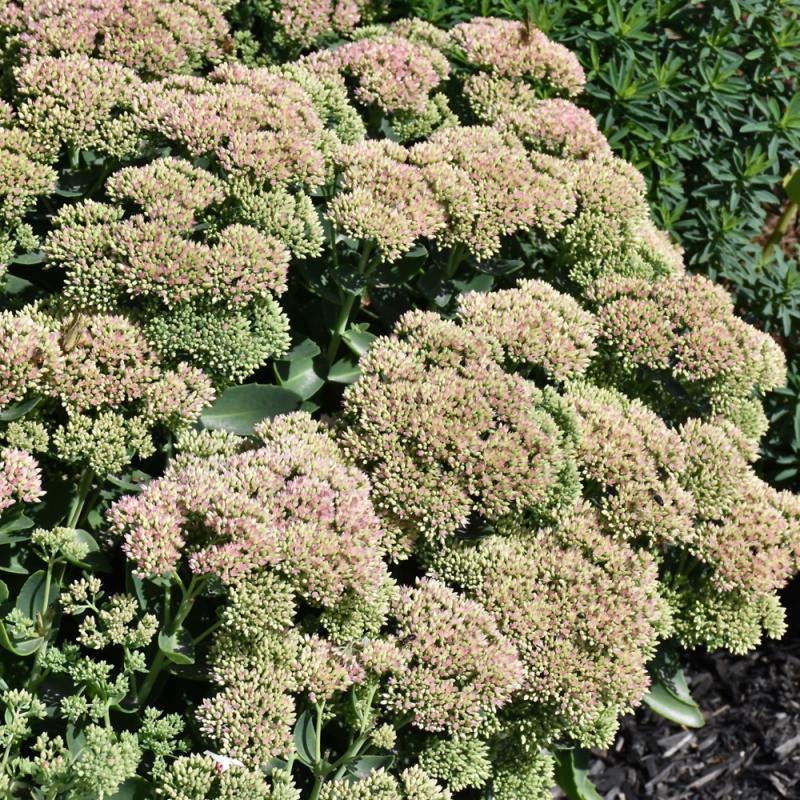 A highly desirable and popular groundcover, forming a dense mound completely covered in broccoli-like salmon-pink flowers which fade to red in early fall, succulent dusty-green foliage is prominent the rest of the season; needs a dry and sunny location