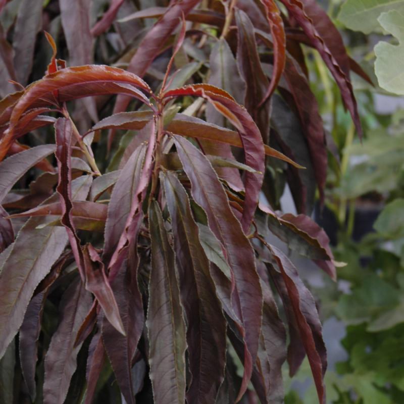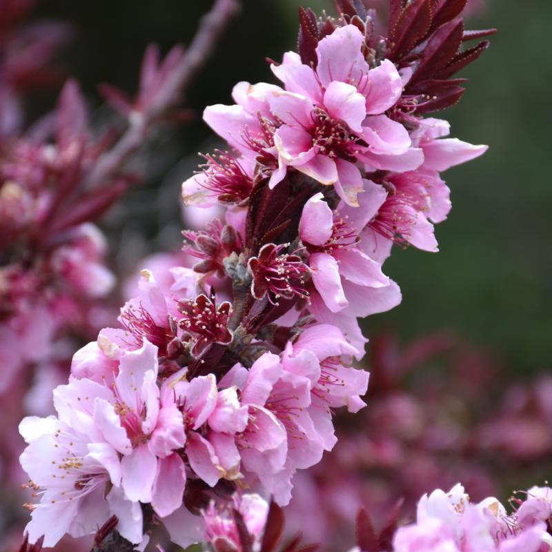 A popular dwarf peach that is quite ornamental, with showy pink flowers in spring and a low, spreading habit; stunning burgundy-purple leaves all season long; will tolerate some shade but needs full sun most of the time and well-drained soil
