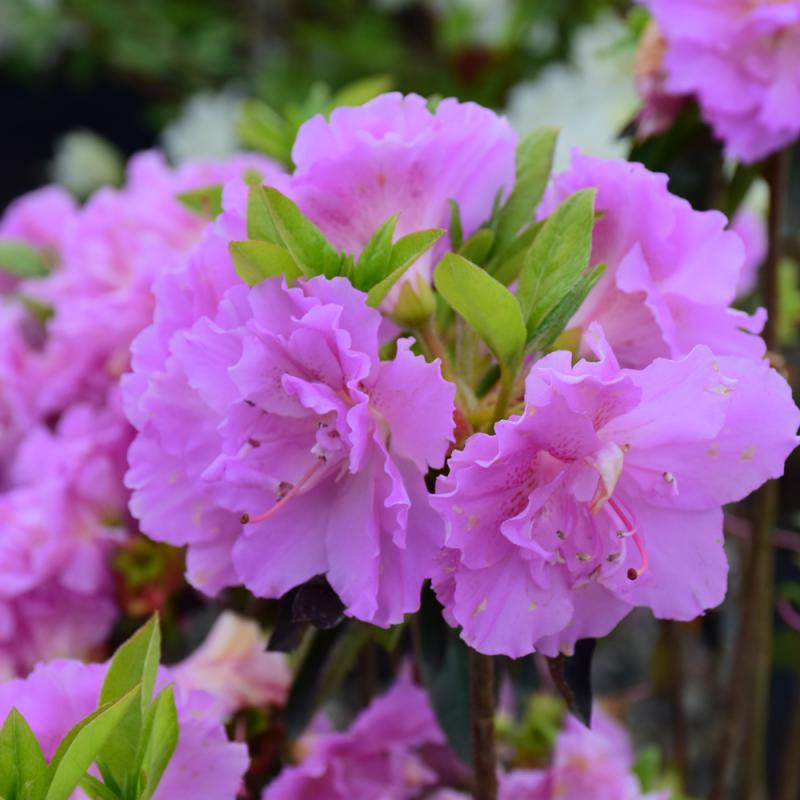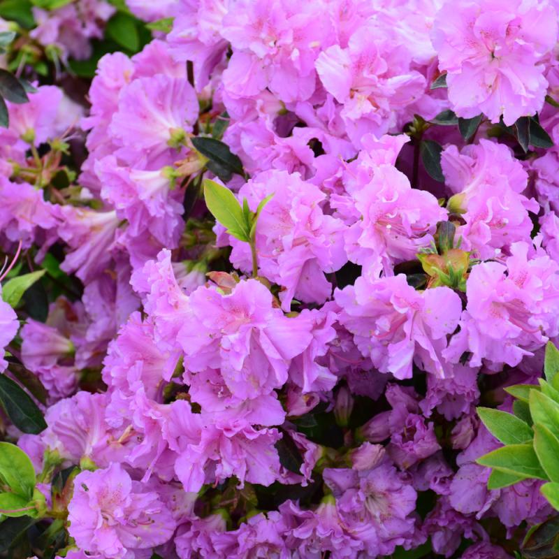 Clusters of pink blooms with lavender highlights, some semi or double, cover this azalea in mid to late spring; a compact rounded shrub with attractive leaves that progress to yellow in the fall; needs highly acidic and organic soil that is well drained