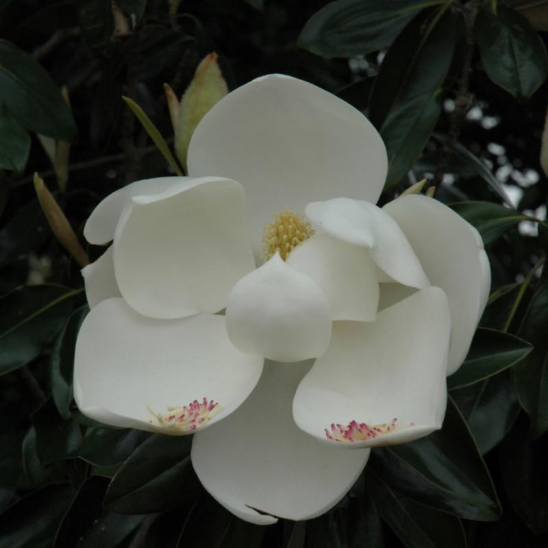 A beautiful flowering accent tree for smaller home landscapes, smothered in showy and fragrant white cup-shaped flowers in spring through summer; large glossy leaves with reddish-brown undersides and a neat pyramidal habit of growth