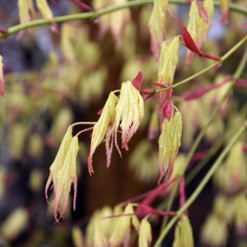 Creamy leaves have green veins and rose undertones from spring through summer, turning bright yellow in fall; a shrubby form with an elegant vase shape habit, often grows wider than tall