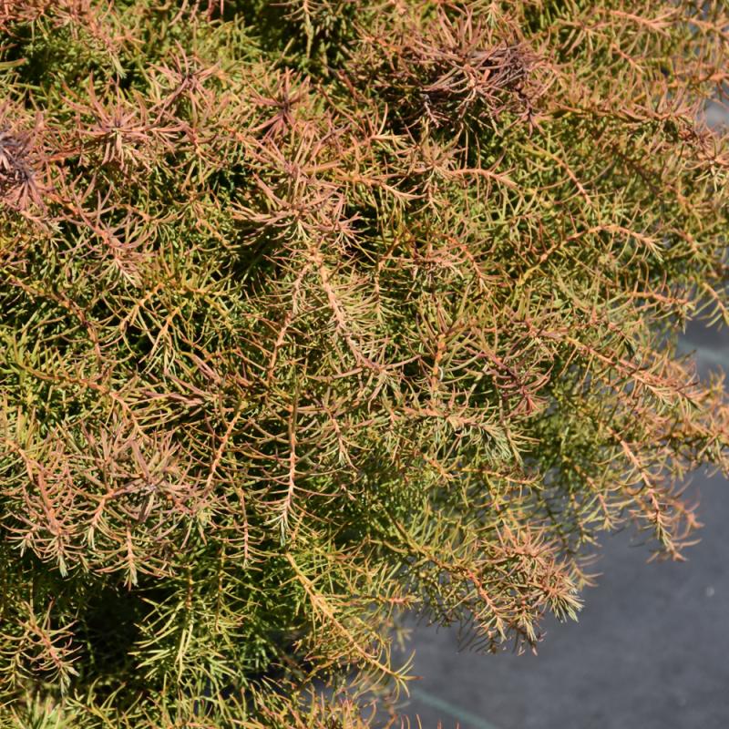 A compact rounded shrub that is slow growing and dwarf in stature; foliage is a fine display of tiny needles arranged on branchlets and are a lovely blue-green color that bronzes in winter; an excellent accent shrub for the garden or rockery