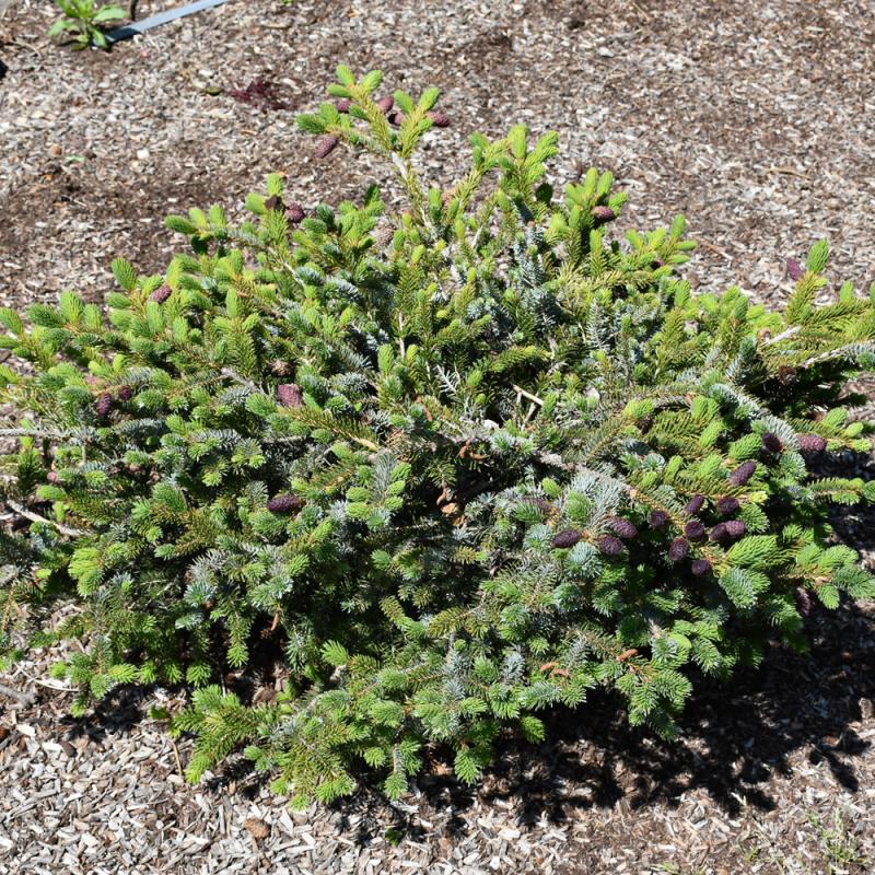 This cultivar forms a mound that can be kept that way with pruning, if central leader is left alone will become a pyramidal tree; unique green foliage with silver blue undersides, violet purple cones are breathtaking; an outstanding focal point