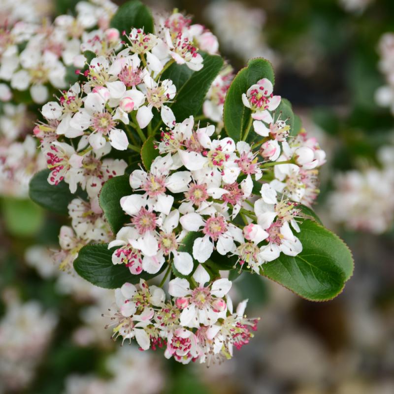 A compact, low mounded variety with glossy dark green leaves, and showy white flowers in spring; a great choice for edging and groundcover; brilliant red foliage in fall to contrast the dark purple-black fruit; very adaptable
