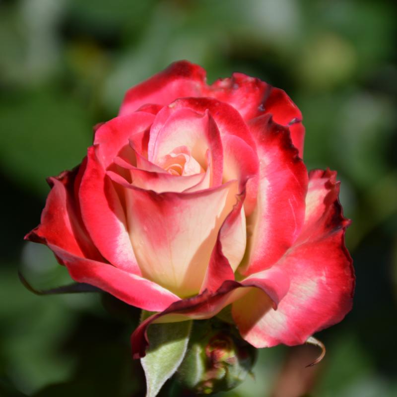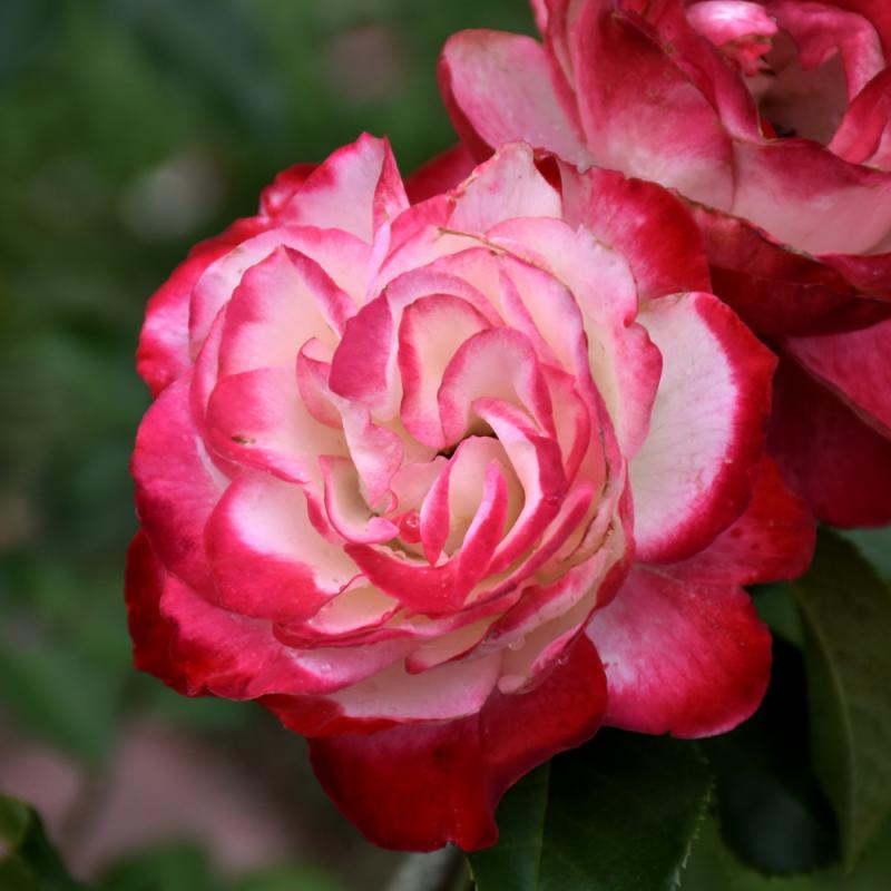 A tea rose with the most breathtaking flowers, where every petal starts out cherry red and fades to white in the center, with white backsides as well; all roses need full sun and well-drained soil