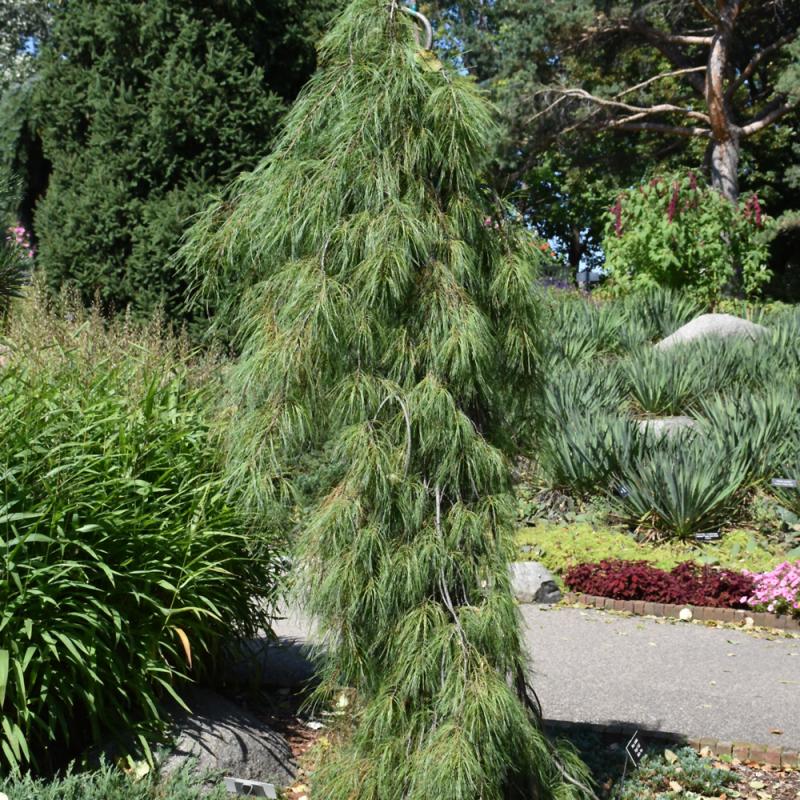 This is a refined version of the popular weeping white pine; extraordinary long narrow blue-green needles, a strong weeping habit, and a profusion of buds and branches make this one a superior pick as a garden accent