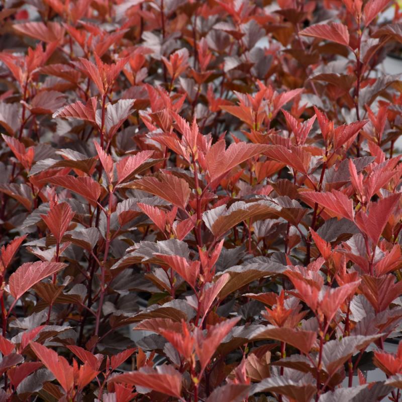 This stunning variety broadens the color palette for these easy care shrubs; foliage emerges sunny orange and matures to a shiny deep burgundy; showy white flowers in spring, turning to red seed heads; also has interesting peeling bark; best in full sun
