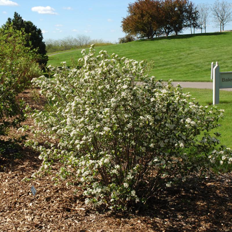A compact shrub with glossy dark green leaves, showy white flowers, glossy black berries, and red and purple fall colors; a great choice for massing or grouping, deserving of much greater use in the landscape