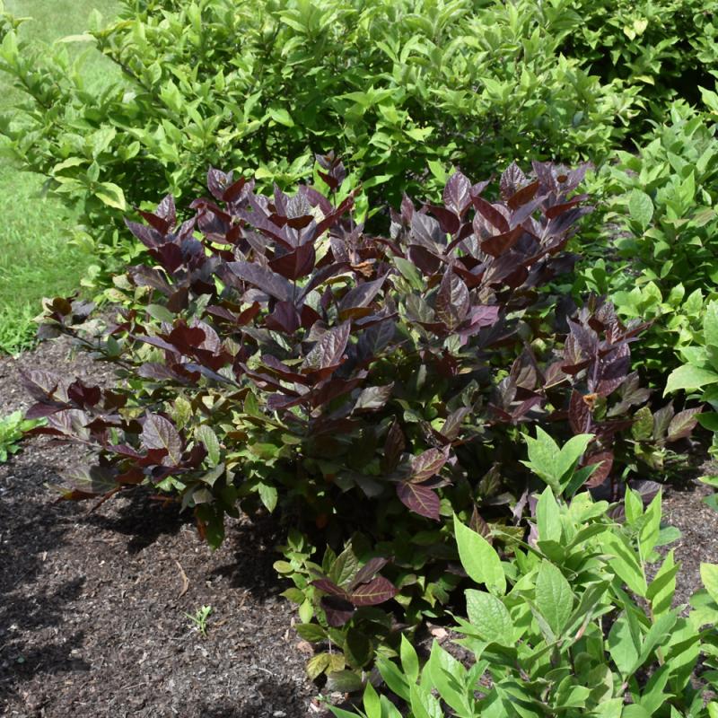 A compact, rounded shrub with reliable sweet spicy fragrance emanating from interesting dark red flowers; deep purple-burgundy leaves transition to shades of yellow and orange in the fall, extending its visual impact; easy to grow and low maintenance