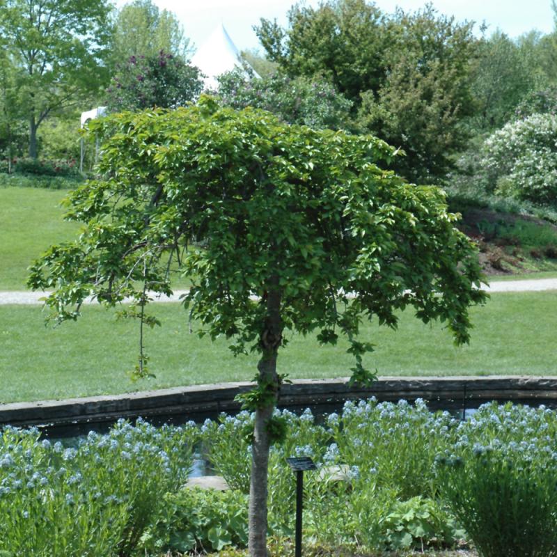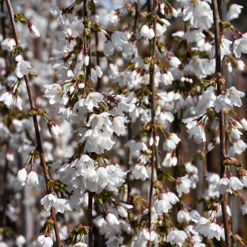 A breathtaking new garden accent shrub with an abundance of snowy white flowers in early spring on a gracefully weeping and arching plant; merits use as a solitary where it can be appreciated, requires some training; needs full sun and well-drained soil