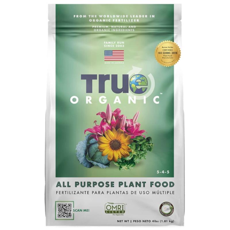 True Organic™ All Purpose Plant Food is blended from natural & organic farm-grade ingredients that are used to make fertilizers for Americaʼs organic produce growers. The all-purpose formula is proven to be extremely beneficial for both plants and soil. Contains : seabird guano; a great source of phosphorous and slow release nitrogen, shrimp shell and crab shell meal; a sustained supply of calcium and nitrogen for soil and plants, poultry manure; ethically sourced from organically raised birds, and organically sourced soybean meal. No sludge, fillers or additives. For in-ground and container plants. Apply once per month around your garden during the growing season for abundant organic fruits, flowers, vegetables, herbs and foliage. One four-pound bag covers up to 87sq ft. NPK Analysis : 5-4-5. OMRI Listed®.