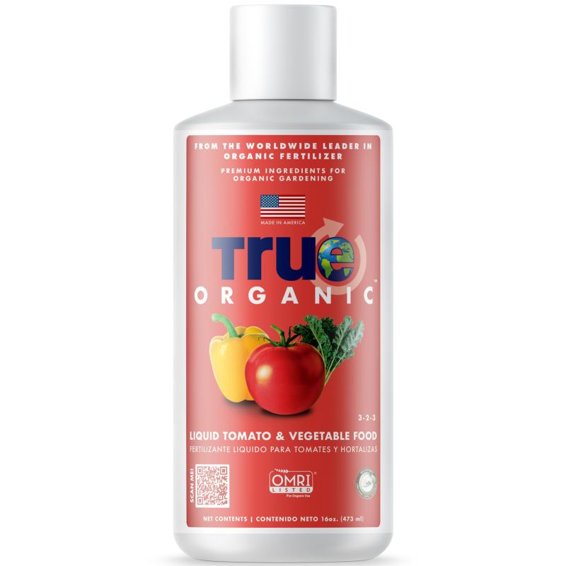 True Organic™ Liquid Tomato & Vegetable Food is blended from natural & organic farm-grade ingredients that are used to make fertilizers for America's organic produce growers. The tomato and vegetable formula is blended with soy protein Hydrolysate - an exclusive blend of farm-grade ingredients proven to be extremely beneficial for both plants and soil. For in-ground and container plants, both indoors and outdoors. Apply every two weeks during the growing season to help grow superior harvests of organic fruits and vegetables. One 16oz. bottle covers approximately 30 sq. ft. when mixed at a rate of 2oz per gallon of water. NPK Analysis : 3-2-3. Concentrate. OMRI Listed®. Use every two weeks.