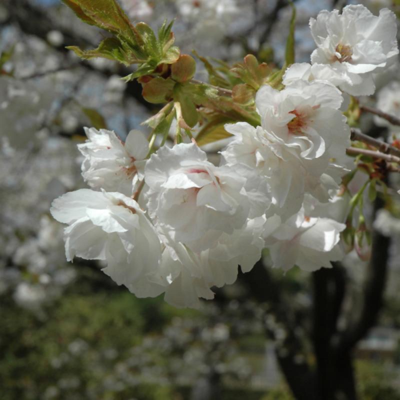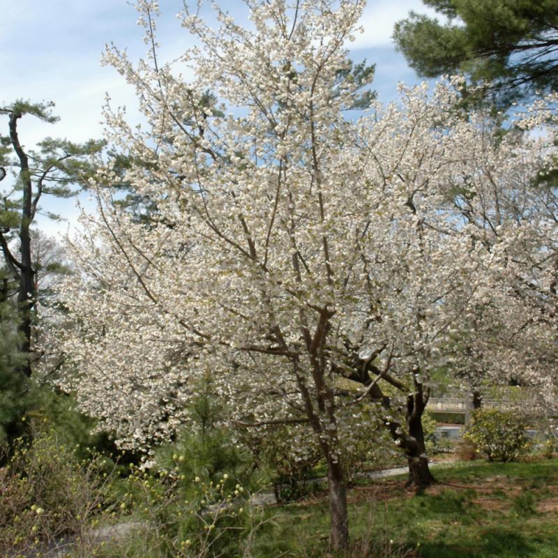 A superb landscape ornamental smothered in semi-double white flowers in early spring before the leaves, stunning bronze bark, good fall color and spreading habit; one of the most renowned heritage varieties, needs full sun and well-drained soil