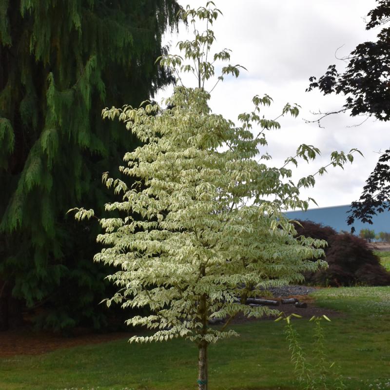 A lovely upright dogwood with rich, contrasting green and white leaves, turning shades of red and pink in fall; covered in gorgeous white blooms in late spring; vigorous and tolerant of most soils except very wet or dry
