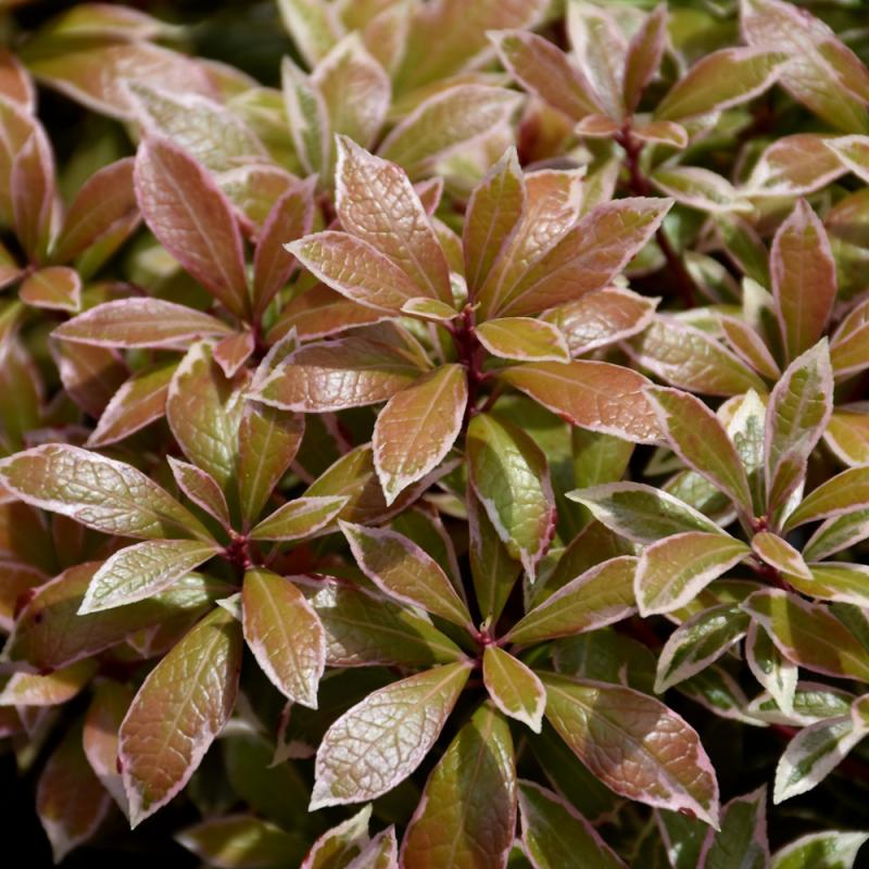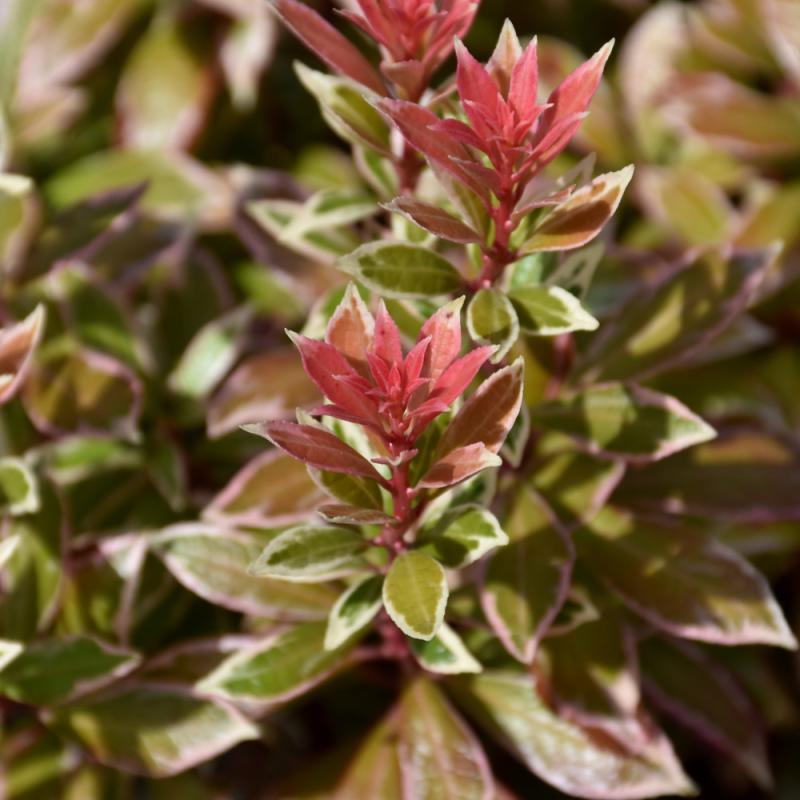 A smaller variety with showy chains of small white bell-shaped flowers and bright scarlet emerging foliage that matures to dark green with white edges; performs best in moist, organic and acidic soils
