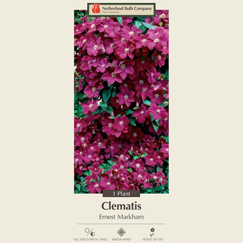 ‘Ernest Markham’ clematis features rich, velvety red flowers that create a dramatic display on climbing structures and garden walls.