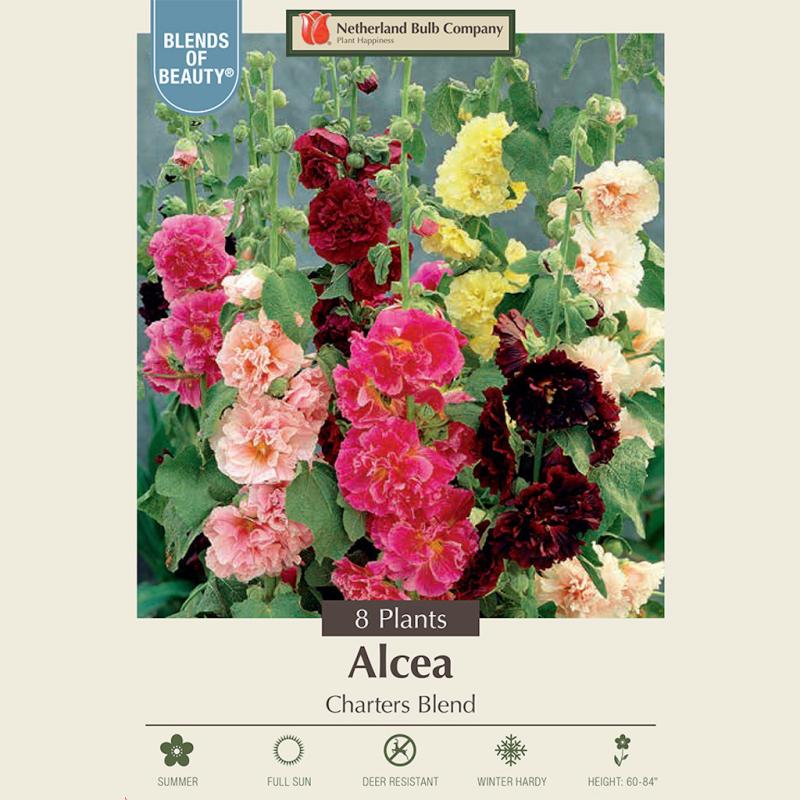 Alcea ‘Charters Blend’ produces tall spires densely packed with double flowers in classic hollyhock colors. A cottage-garden staple, it adds vertical interest and old-fashioned charm.