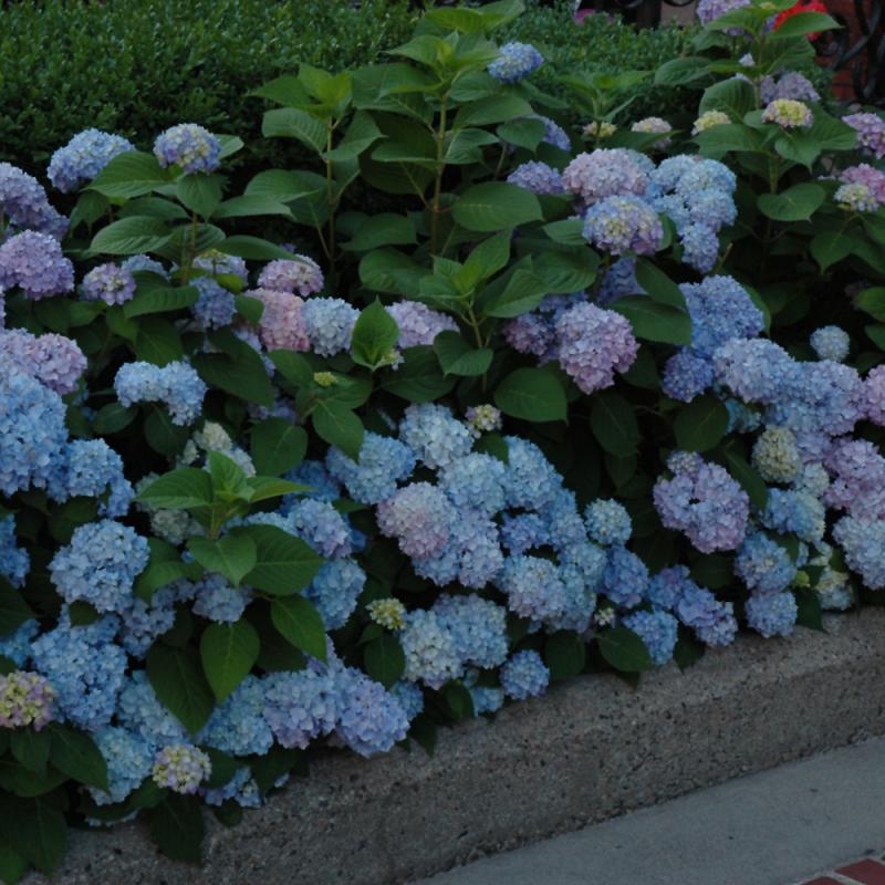 This is one of the showiest and most popular of all summer-blooming shrubs with enormous deep blue globe-shaped flowers, requires highly acidic soils to maintain blue color; blooms on old wood so protecting flower buds in winter may be necessary