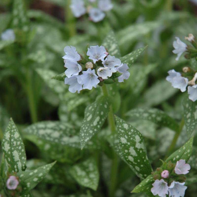 Opal Lungwort features delicate clusters of sky blue bell-shaped flowers at the ends of the stems from mid to late spring, which emerge from distinctive shell pink flower buds. Its attractive narrow leaves remain emerald green in color with distinctive silver spots throughout the season.
